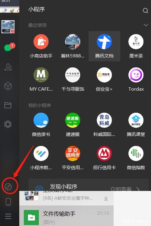 除了手机微信app找出微信小程序,还可以通过最新版本的电脑微信软件登录微信后,点击页面左边的小程序图标也是可以查看和搜索到使用过的微信小程序。