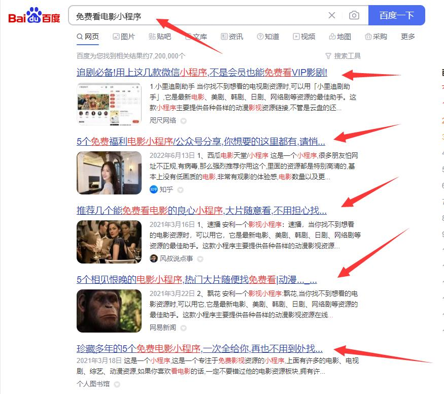 《在哪个小程序里可以免费看电影?这里推荐5个无广告可以免费看电影的小程序》这个标题就包含了:电影小程序、无广告电影、免费看电影等等。而且这些自媒体权重很高一但你的文章发布百度或者搜狗这些搜索引擎都会优先展示你的文章。
